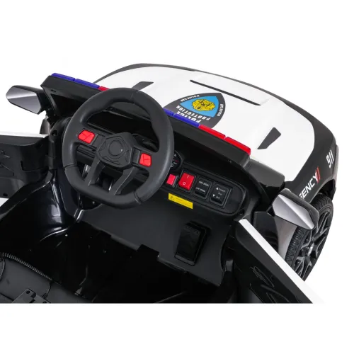 Кермо оснащене кнопками зі звуками та клаксоном, попередньо завантаженими мелодіями та реалістичними звуками поліції, а також мегафоном. Поліцейська машина агентства 911 також має індикатор заряду батареї, який показує рівень заряду, тому ви завжди знаєте, коли її потрібно зарядити. Це ідеальний вибір для дітей, які люблять пригоди та вдають себе справжніми поліцейськими!