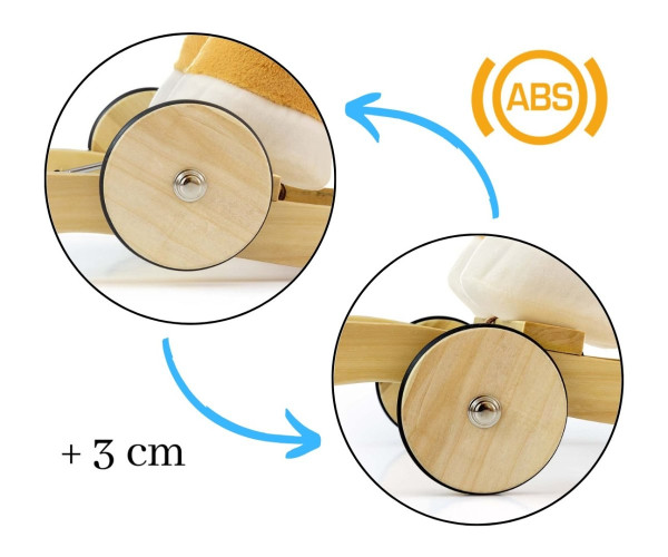 Коник має дерев'яні гойдалки з підставками для ніг та ручками, які допомагають підтримувати рівновагу під час гри, а також комплект складних коліс, які за лічені секунди перетворюють його на чудовий плюшевий транспортний засіб.