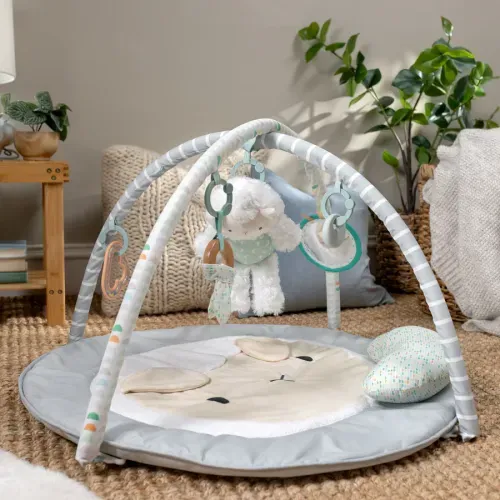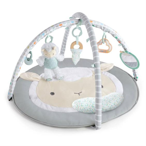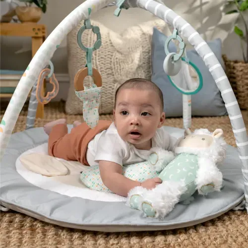 Розвиваючий килимок Ingenuity Sheppy's Spot Corri - коли ваше маленьке янголятко буде готове до ігор, ігровий килимок Ingenuity Sheppy's Spot Plush Activity Gym надасть дитині зручне, безпечне місце для ігор на животику, сидячи, а також лежачи та граючись. Килимок м'який, як хмаринка, і включає в себе подушку для підтримки животика, яка допомагає новонародженим і старшим розвивати силу шиї, забезпечуючи при цьому додатковий комфорт. Немовлятам сподобаються 5 знімних іграшок, які підвішуються на знімній дузі для іграшок, серед яких: плюшева іграшка Шеппі, кільце з натурального дерева з сенсорною тканиною, іграшка з натурального силікону, дзеркальце зі стрічками та брязкальце з намистинками, які допомагають заспокоїти та розважити малюка. Іграшка Шеппі Plush Toy, новий улюблений друг дитини, поміститься прямо в сумку мами, щоб обійматися з нею в дорозі. Килимок приємний для очей і створений, щоб доповнити будь-яку тему дитячої кімнати, від кольорової до нейтральної, від тварин до природи. Його також легко чистити, зберігати або брати з собою в дорогу - просто зніміть дугу для іграшок. Овечки прив'язуються до своїх малюків так само, як і ми, і запам'ятовують особливі моменти на довгі роки! Покладіться на те, що Sheppy подарує вам і вашому малюку найсолодші спогади на довгі роки.