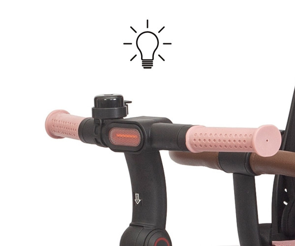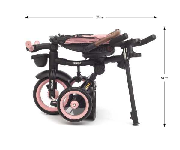 Оснащений регульованою ручкою для керування, функцією вільного колеса, гальмом, а також ременями безпеки з кожухами та зручною спинкою з триступеневим регулюванням - Twinkle гарантує повний контроль і комфорт для дитини та батьків. Легка, але міцна сталева рама, пінопластові колеса на підшипниках, складна конструкція та практичні аксесуари, такі як капюшон з сіткою, світлодіодне освітлення, тримач для напоїв та 2 багажники, роблять його ідеальним вибором для будь-якої нагоди – в місті, на прогулянці або в подорожі. Після демонтажу ручки для штовхання, поручнів і капюшона Twinkle буде служити як класичний триколісний велосипед.