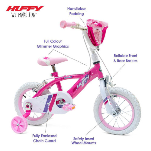 Дитячий велосипед Huffy GLIMMER 12" Rose 72039W - модель з 12-дюймовими колесами для дівчаток 3-5 років із маленькими тренувальними колесами в комплекті. Huffy Glimmer вже став фаворитом юних дівчаток-велосипедистів, які хочуть навчитися їздити, при цьому виглядати стильно та вишукано, як справжні принцеси. Huffy GLIMMER 12" зі знімними бічними колесами чудово підходить для велосипедистів-початківців; ідеальний для дітей 3-5 років і зростом 98-112 см. Завдяки яскравому сміливому рожевому кольорі та тканинній торбині для зберігання речей на передній ручці в поєднанні з блискучою графікою, дозволить дитині відчути себе зіркою. Велосипедне сидіння гарно оббите та наповнене. Велосипед ідеально підходить для сімейних поїздок по парку, колеса підтримуються спицями з легкого сплаву. Швидка та легка збірка - усі дитячі велосипеди Huffy Glimmer оснащені нашою відомою системою Quick Connect, яка робить збірку наших дитячих велосипедів швидкою та легкою - виконайте 4 прості кроки, і ви кататиметеся за лічені хвилини, вставте вилку та кермо - складіть педалі до клацання - вставте сідло та відрегулюйте, вперед! Зібрати велосипед ще ніколи не було так просто!